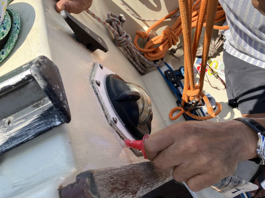 そして、ここからはオマケの、コンパスの雨漏りとウィンチハンドルカバーの取り付け。なんと、みなさんが残って作業をしてくださった。