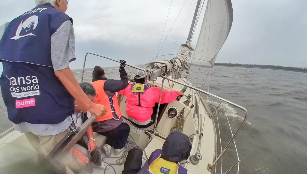 ブラインドセーリングとは、視覚障がい者(ブラインド)と、晴眼者(サイテッド)が、役割を分担してヨットを操船するスポーツです。舵をとる「ヘルムスパーソン」はブラインドが、大きな帆のメインセールをコントロールする「メイントリマー」もブラインドが担当します。ヨットの前方にある小さな帆のジブセールはサイテッドの「ジブトリマー」が担当し、全体の状況を見たり指示をだす船長の「スキッパー」はサイテッドが担当します。(公式のレースは4名でのチーム編成ですが、JBSAの活動ではそれ以上の参加者でセーリングをおこないます。)
